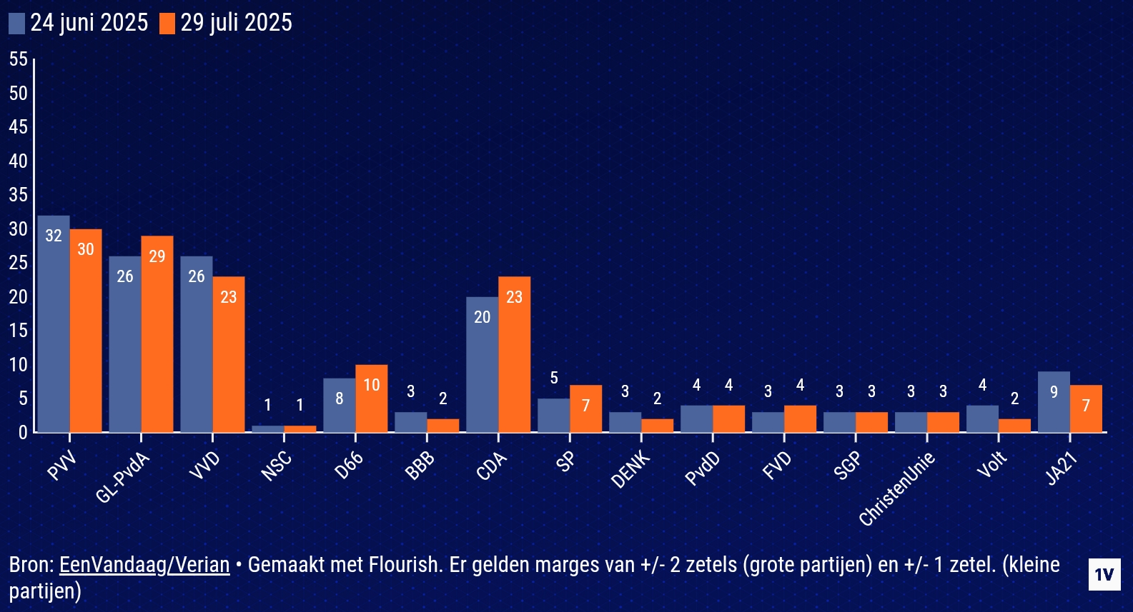 janneke141 remlof PVV-VVD-CDA precies een meerderheid. Niet dat een peiling nu al te veel zegt, maar als dit de echte uitslag zou zijn ben je toch benieuwd hoe recht de ruggen zijn.
